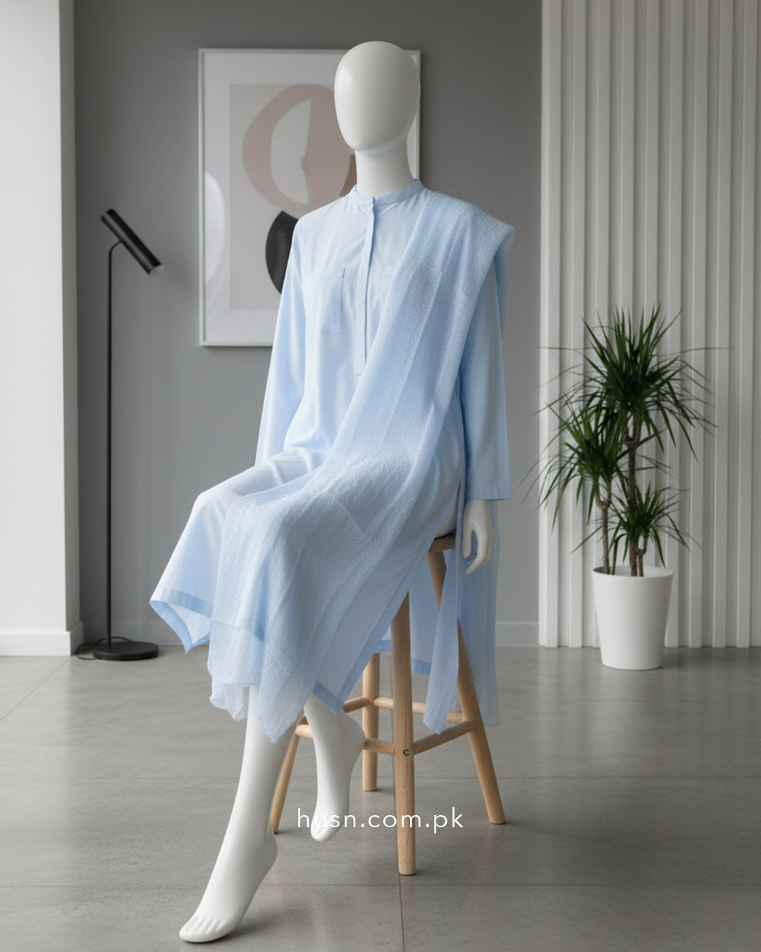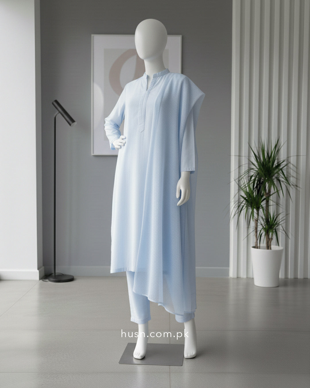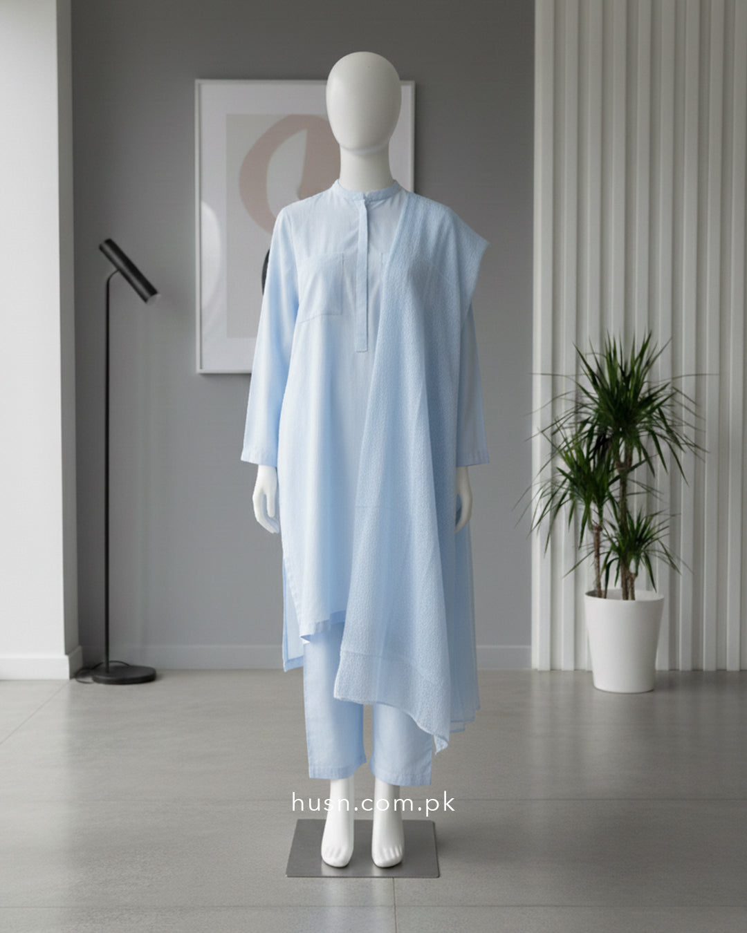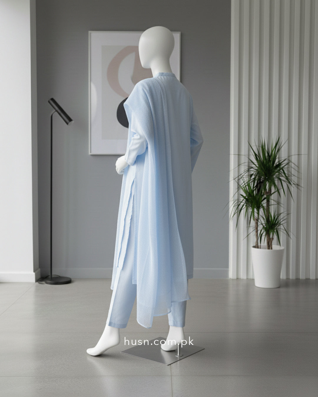 This ensemble features a minimal shirt accented with stylish twin pockets, adding a modern yet subtle touch to its clean silhouette. Paired with a plain, straight trouser for timeless simplicity, the look is finished with a soft, plain chiffon dupatta that drapes beautifully and completes the refined aesthetic.