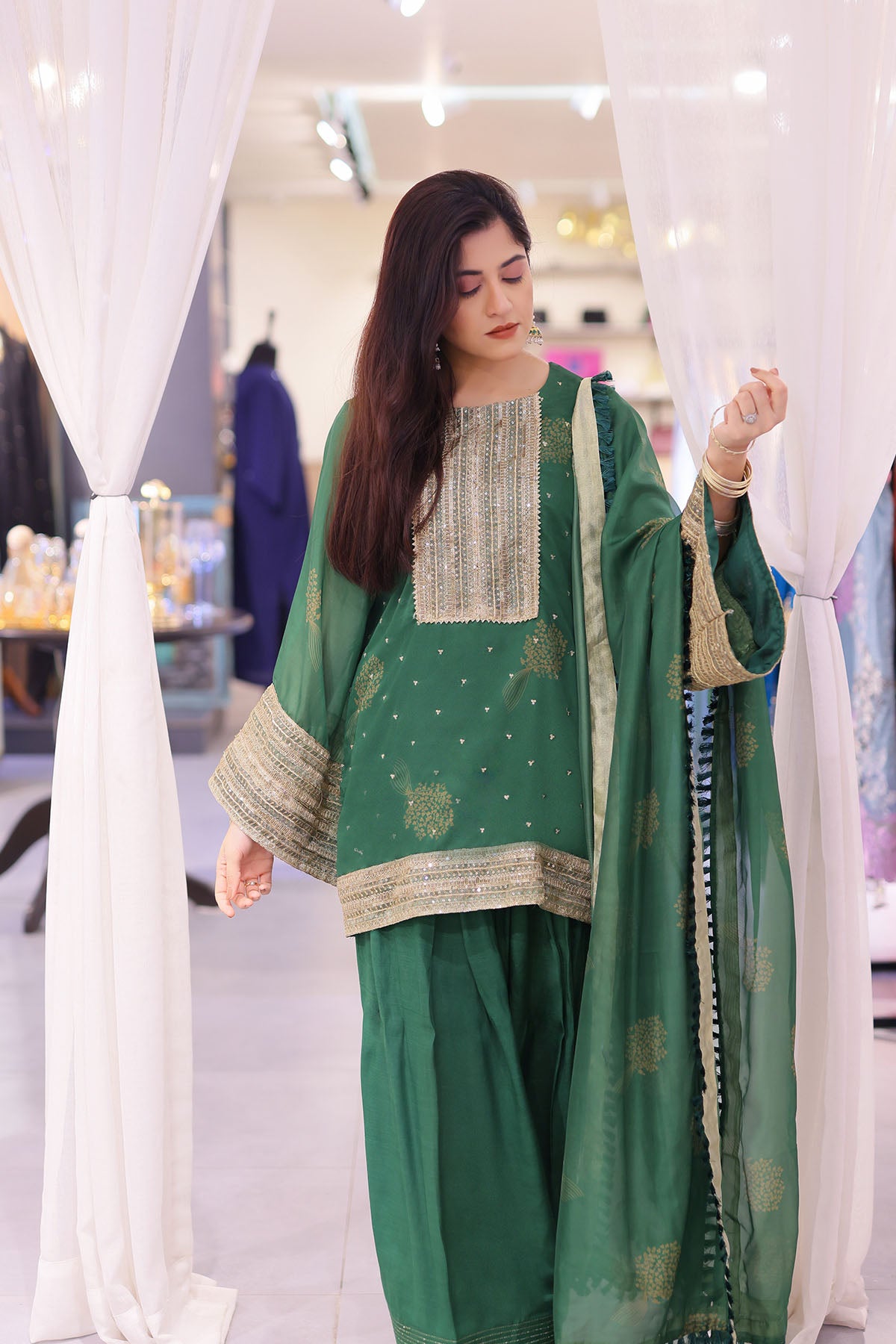 Paired with a plain silk farshi shalwar, the ensemble maintains its traditional charm while ensuring effortless grace. Completing the look is a beautifully printed silk dupatta, finished with thread tassel lace for an artisanal finish.