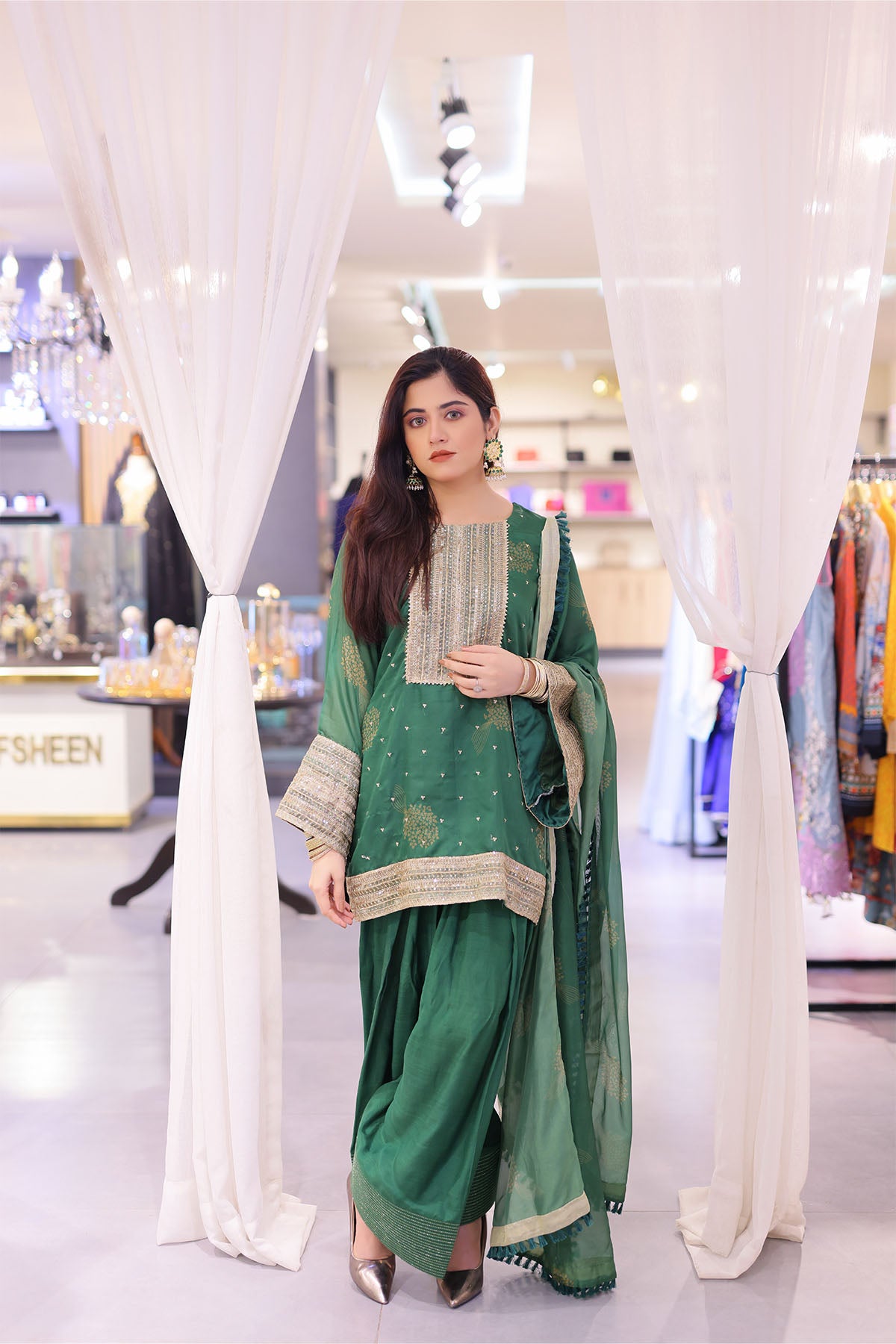 ndulge in timeless elegance with our 3-piece Farshi Shalwar Suit, crafted from premium printed silk for a luxurious fall and refined drape. The shirt features a delicately embroidered neckline and sleeves, adding a touch of handcrafted sophistication to its classic silhouette.